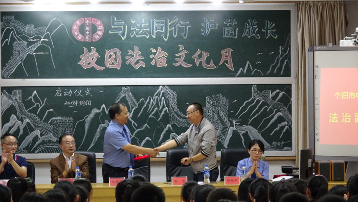 为全面贯彻落实最高人民检察院“一号检察建议”和云南省人民检察院《关于进一步深化贯彻落实最高人民检察院“一号检察建议”工作的通知》精神和要求,切实预防和减少在校学生违法犯罪,推进校园安全管理和未成年人法治教育工作。9月6日,个旧市检察院万买富检察长受聘担任个旧中学法治副校长,并受邀为个旧中学部分学生讲授了一堂生动的法治课。