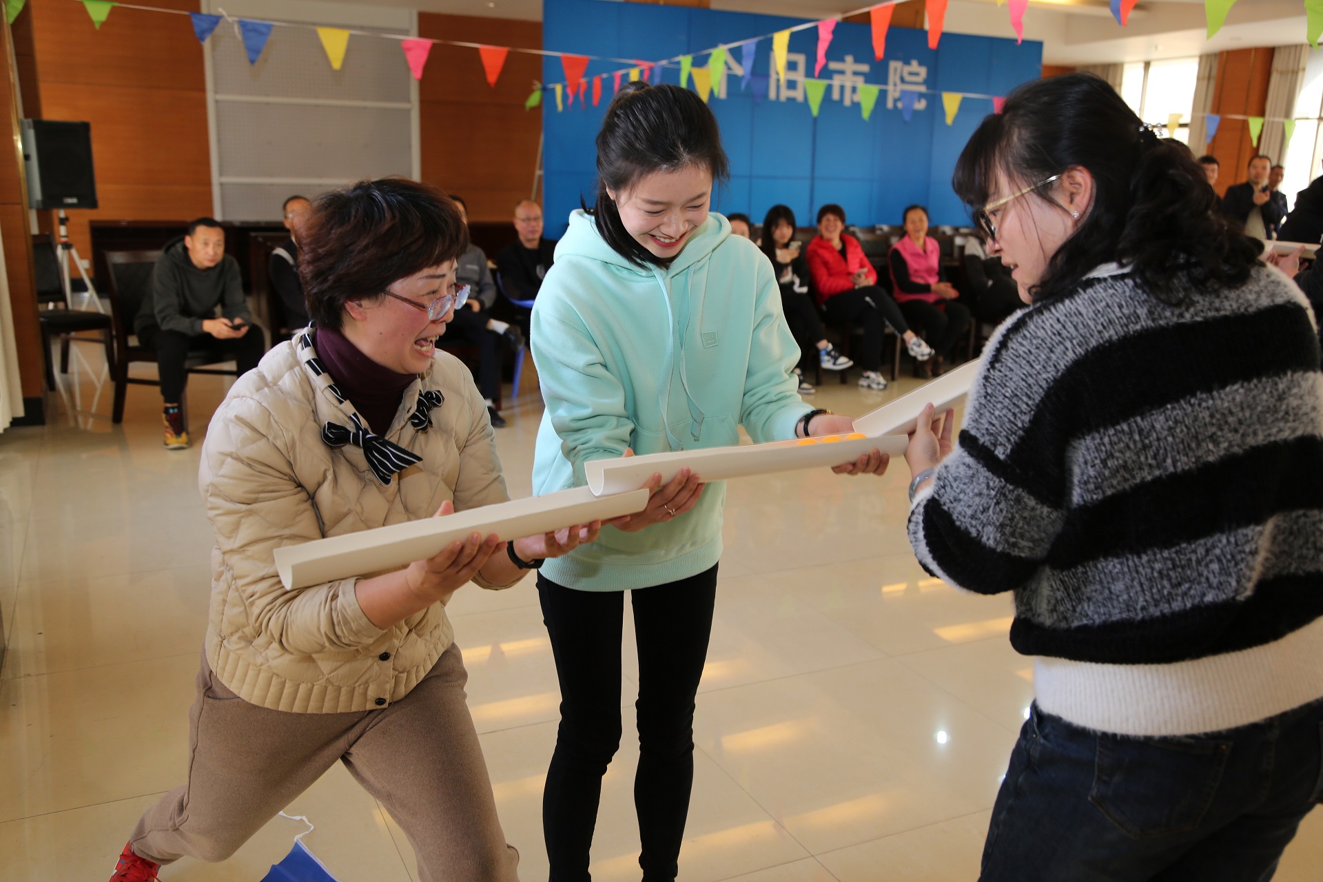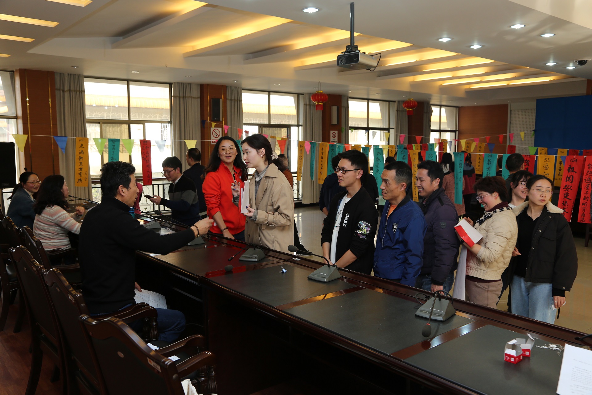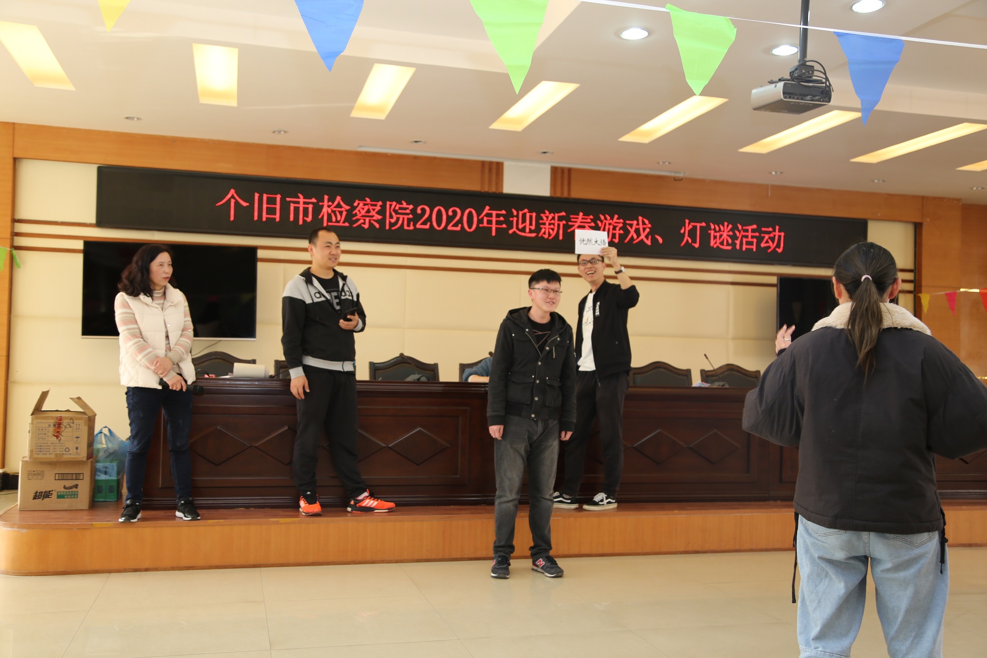 下午欢乐继续,工会准备的“你比我猜”、“运乒乓球”、“趣味灯谜”等趣味活动充分吸引了全院干警的兴趣,调动了大家的积极性,活动中有人配合默契,有人则逗笑全场,此外还准备了上百个灯谜等待解密,干警热情高涨,争相答题,经过一番思考,灯谜答案一一揭晓,一时间答题换奖品的队伍排成了长龙。