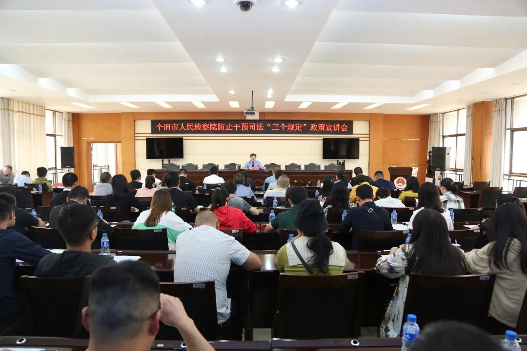 开展防止干预司法“三个规定”宣讲,既是政法队伍教育整顿查纠整顿工作的一项重要内容,也是严格执行“三个规定”,促进司法公正的一次庄严承诺行动。对推动全市政法队伍教育整顿走深走实、保障司法机关依法独立公正办案、提高司法公信力具有重要意义。按照省、州、市政法队伍教育整顿统一部署,6月17日个旧市人民检察院召开防止干预司法“三个规定”政策宣讲会。个旧市贾沙乡、保和乡、市发改局、市工信局、市自然资源局、州生态环境个旧分局的班子成员、部门(科室)负责人、职工代表等共计60余人参加。