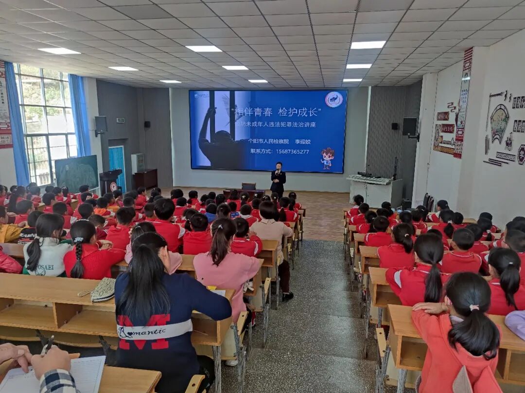 为持续深入开展普法强基补短板专项行动,进一步贯彻落实《未成年人保护法》《预防未成年人犯罪法》及相关法律法规,加强青少年普法宣传教育,推动提升未成年人尊法、学法、守法、用法意识,营造预防未成年人违法犯罪及保护未成年人合法权益的社会氛围,为未成年人健康成长提供更加有力的司法保障。2023年5月以来,个旧市人民检察院未检干警分别走进个旧市第六中学、个旧市人民小学等多所中、小学开展“相伴青春 检护成长”法治宣传教育进校园系列活动,为青少年系好“第一颗法治纽扣”。