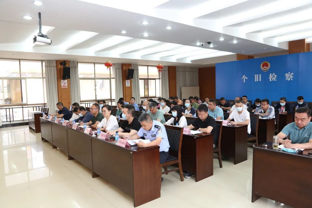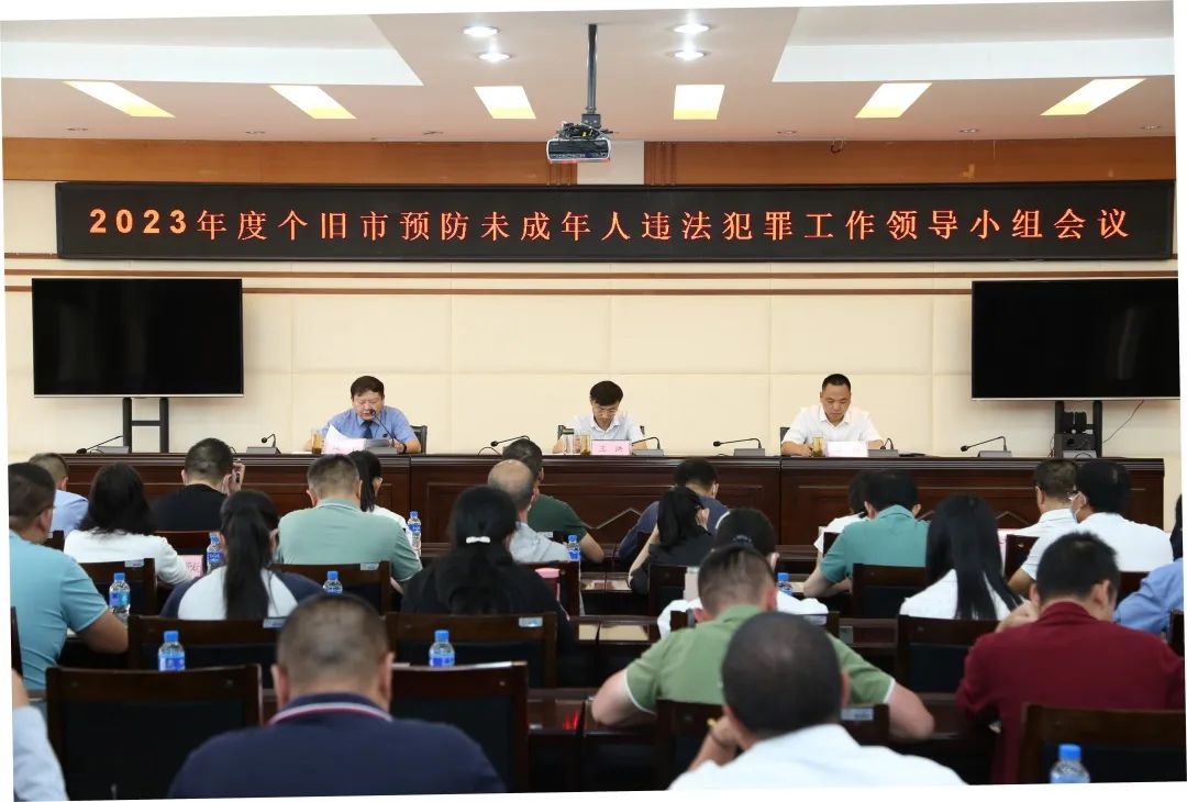 为深入贯彻落实2023年度省、州预防未成年人违法犯罪工作领导小组会议精神和要求,进一步优化“党委领导、政府负责、司法保障、社会协调、公众参与”工作格局,提升预防未成年人违法犯罪治理能力,围绕“双下降一底线”的工作目标,全面分析全市未成年人违法犯罪形势,查找工作问题及短板,压实成员单位及相关部门责任,安排部署下一步工作。6月6日上午,2023年度个旧市预防未成年人违法犯罪工作领导小组会议在个旧市人民检察院召开。市委副书记、沙甸街道党工委书记王洪,副市长曹耀,市人民检察院党组书记、检察长糜华及市预防未成年人违法犯罪工作领导小组成员单位负责同志和联络员、办公室全体人员、市专项普法工作队队长、云锡公司代表共40余人参加会议。