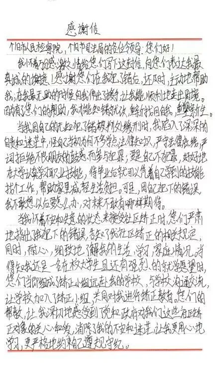 响应群众司法需求、回应群众信任期待,此刻,“司法为民”不是空洞的口号,而是刑执干警将“三个善于”与办案实践相结合的具体实践,社区矫正的目的正是为了使矫正对象改过自新,重新融入社会。正如小段在感谢信里说的,“当我怀着不安和失意的状态来接受社区矫正时,你们严肃地指出了我犯下的错误,告知了我社区矫正的相关规定,同时耐心细致地了解我的生活、学习、家庭情况”。“你们的联合帮教,让我深切地感受到党和政府对我们这些社区矫正对象的关心和爱,消除了我的不安和迷茫,让我更用心地学习,更严格地约束自己遵规守纪”。