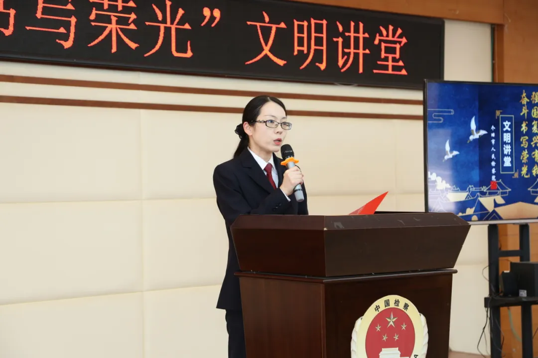 本次文明讲堂分为传文化、诵经典、学先进、扬新风四个阶段。奏唱国歌之后,党组成员、副检察长包颖致辞并送给在座干警三句话。