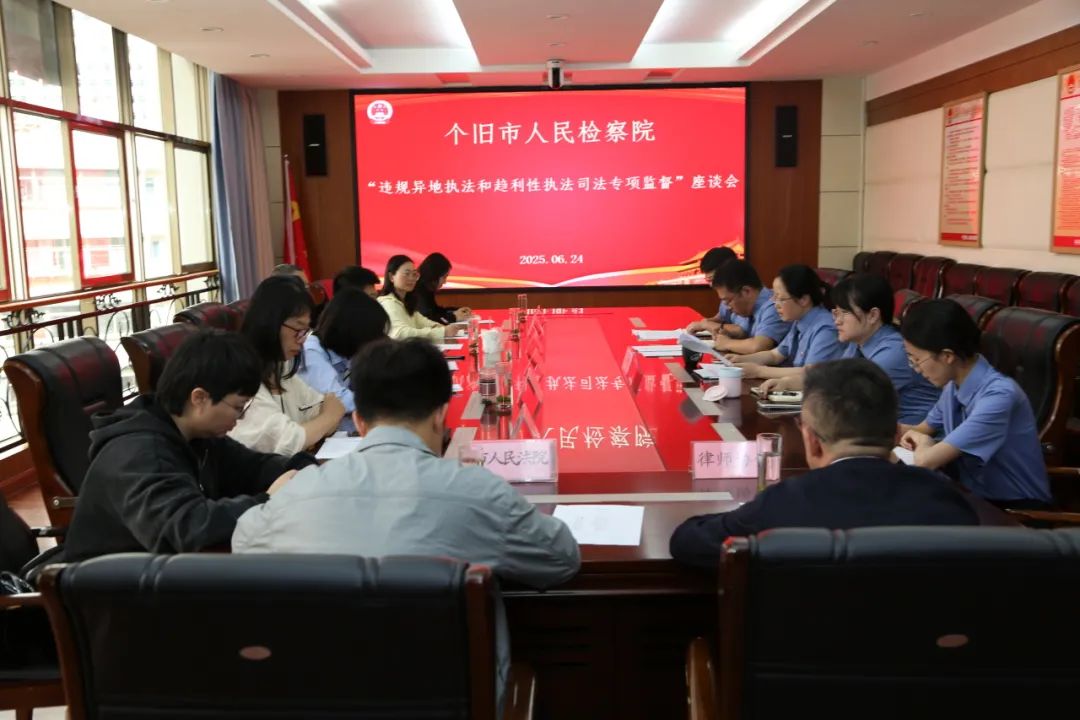 为深入推进“违规异地执法和趋利性执法司法专项监督”工作,凝聚执法司法合力,推动专项监督工作走深走实。2025年6月24日,个旧市人民检察院召开“违规异地执法和趋利性执法司法专项监督”工作座谈会。邀请市人大、市政协、市法院、市公安局、市司法局、市工商联、市国资委、律师协会围绕专项监督工作进行座谈交流。